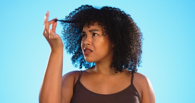 アフロの髪のダメージと問題の髪型の縮れと損失を持つ青い背景に混乱した黒人女性美容院の美容師と治療グルーミングや化粧品のストランドを持つイライラした女の子Premium写真。