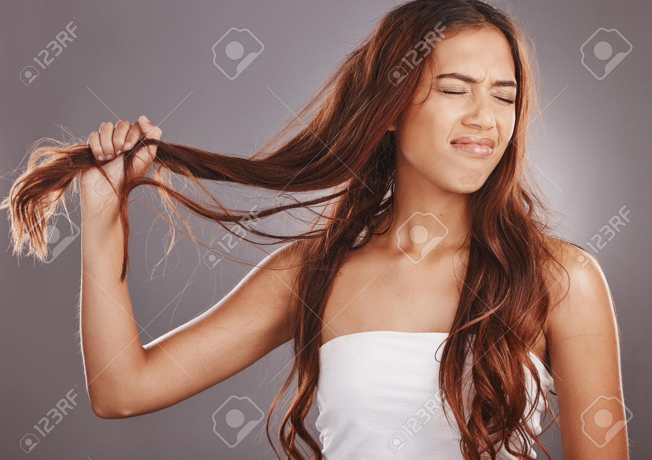 ヘアケア、美容院、欲求不満を感じる黒人女性の迷惑な髪型。スタジオで怒っている灰色の背景を持つ若いモデルのシャンプー、化粧品、ヘアカットの写真素材・画像素材Image 198432833。