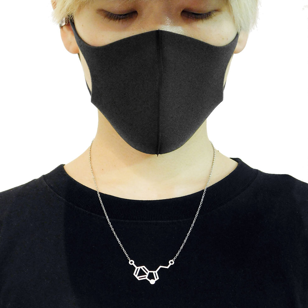 セロトニンの構造式ネックレス black セロトニン C₁₀H₁₂N₂O「幸せホルモン」と呼ばれ、安心感を与えたり気持ちをリラックスさせるはたらきのある脳内物質。感情や気分のコントロール、精神の安定に深くかかわっている。