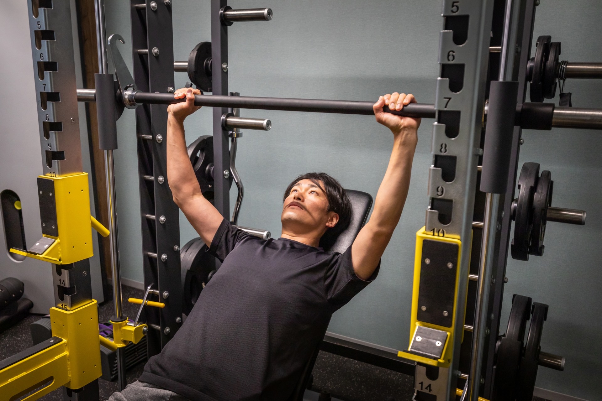 筋トレ女子 スミスマシンで安全に筋トレ バストアップ2種目 ベンチプレス・インクラインベンチプレスヒップアップ2種目 スクワット・ランジ を紹介スーパースミスマシンFMVスポーツ。