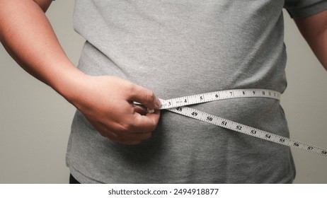 デブ男は脂肪や肥満の測定テープで体脂肪をチェックしますPremium写真。
