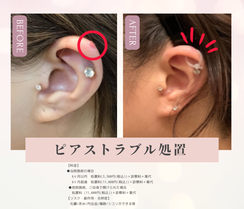 ピアス・肉芽・痛みが出たり治ったりを繰り返しています。ピアス穴あけ 耳のピアス の治療方法・適応。