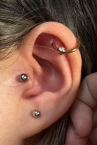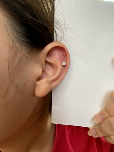 ピアス肉芽ダイアリー時間がかなり開いてしまいました。 軟骨ピアスのトラブルのお話です。 ヘリックスにピアス を開けた後、しばらくは大きなトラブルなく過ぎていて、4ヶ月もするとピアスの存在すらも忘れるくらいになっていました。 久しぶりに鏡でピアスの部分を見。