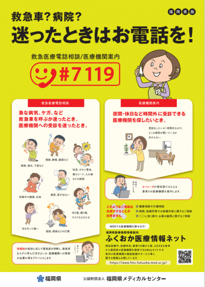 救急車を呼ぶか迷ったら 7119へ!急な病気やけがをしたときに病院へ行くか救急車を呼ぶか迷ったら、まずは#7119にお電話ください。看護師等が24時間体制で相談を受け付けます。 □ プッシュ回線・携帯電話 #7119 □ ダイヤル回線・IP電話 024-524-3020 詳しくは。