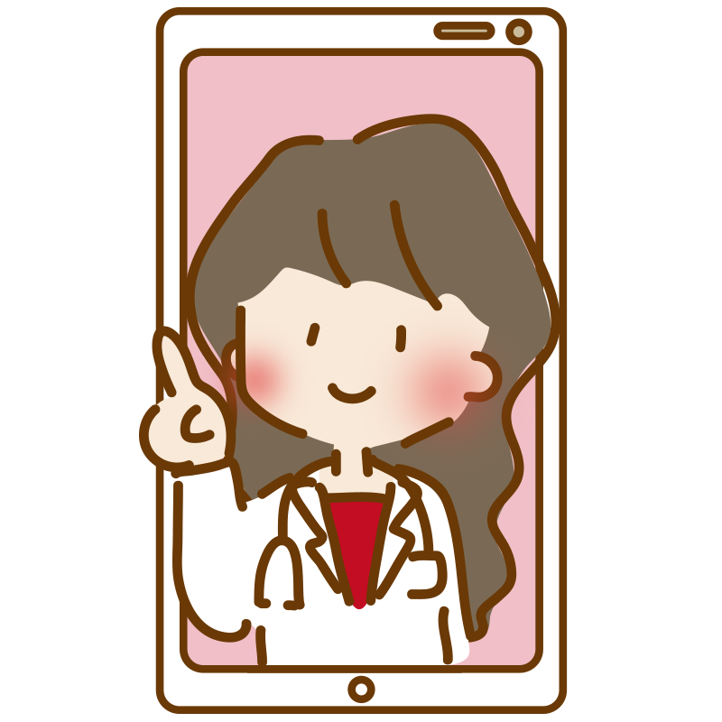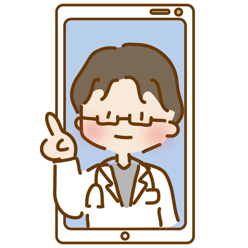 携帯電話でオンライン診療するゆるくて可愛い男性のお医者さんの無料 フリー イラストかわいい 手描きの無料素材「てがきっず」保育園・小学校・介護施設にぴったりのフリー素材イラスト。