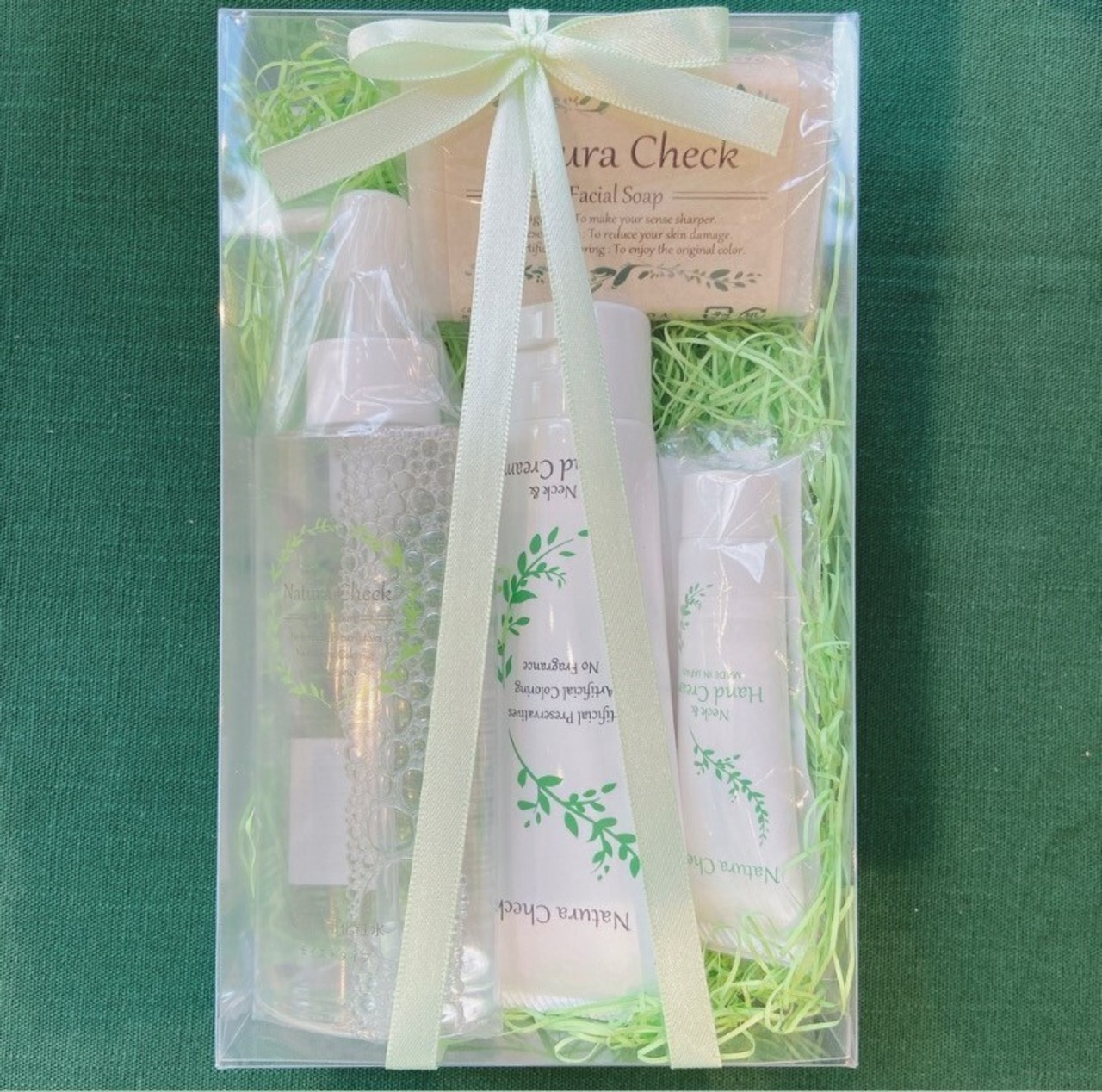 スキンケア商品のギフトボックス🍃 複数の商品梱包パターンに合せて仕切りを設計しています✨リーフレット差込付き😸製作事例まいにち様しぜんのめぐみ水スキンケアギフトパッケージおしゃれデザインタマパックTAMAPACK箱紙箱paperbox。