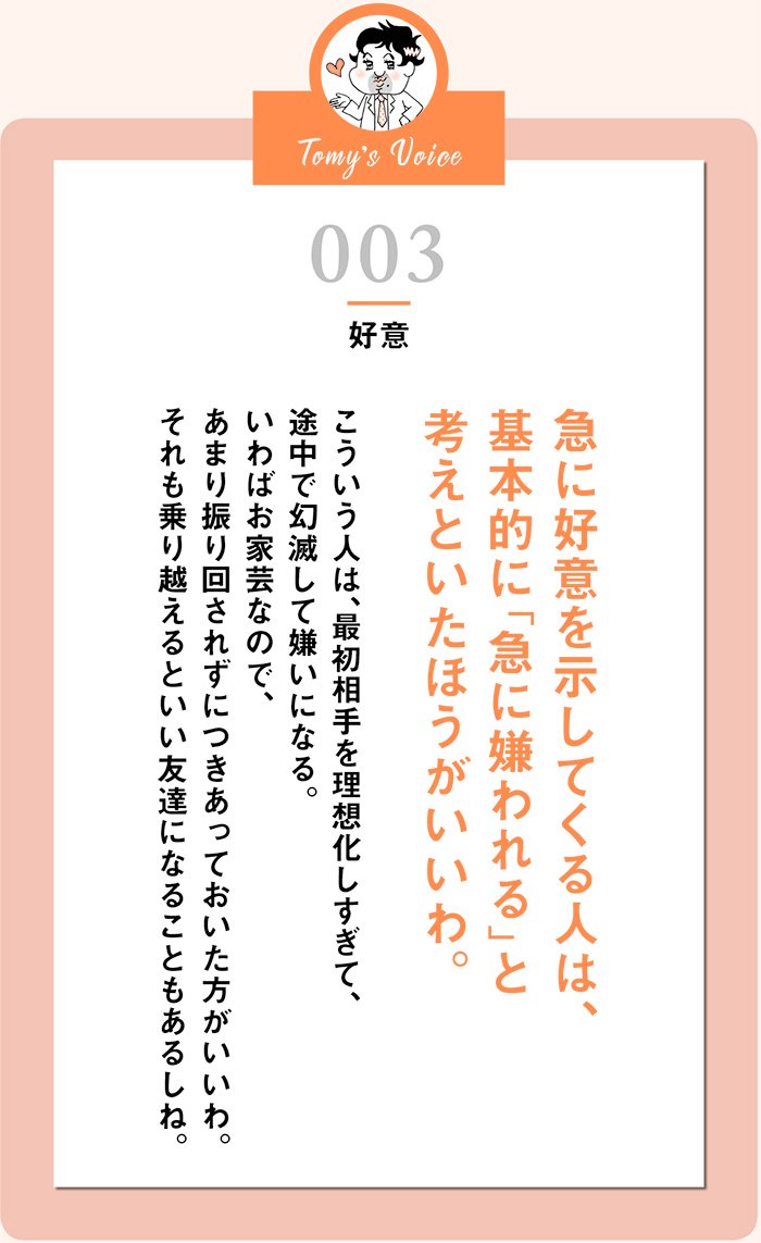 急に好意を示してくる人には急に嫌われる精神科医Tomyが教える 1秒で不安が吹き飛ぶ言葉ダイヤモンド・オンライン。