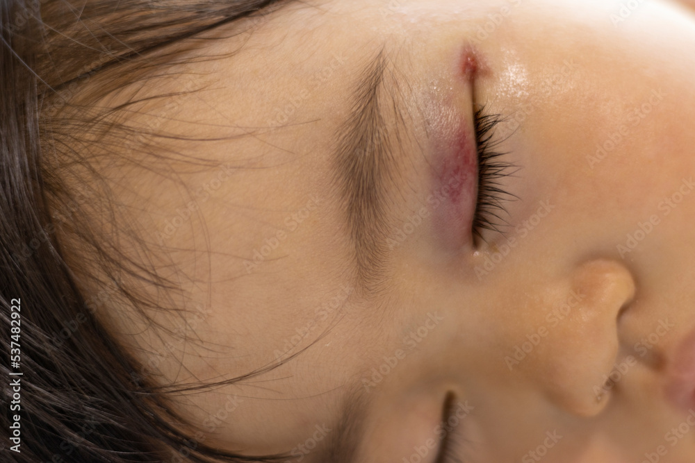 目をぶつけて、まぶたが腫れて内出血している赤ちゃん 2歳3か月、女の子、日本人の Stock フォトAdobe Stock。