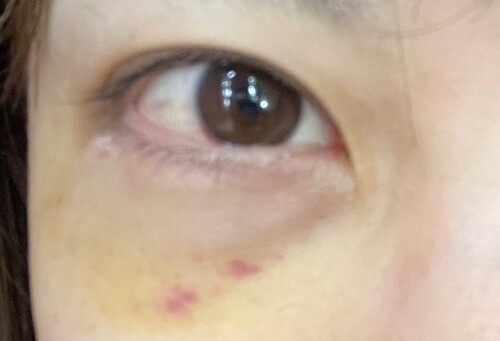 目の下のふくらみ取り+ヒアルロン酸注入 結膜に内出血が続いた例 施術後1か月一例CLASSY 仙台美容外科・美容皮膚科。