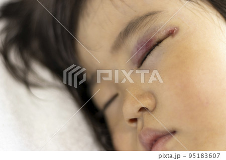 目をぶつけて、まぶたが腫れて内出血している赤ちゃん 2歳3か月、女の子、日本人 の写真素材95183607- PIXTA。