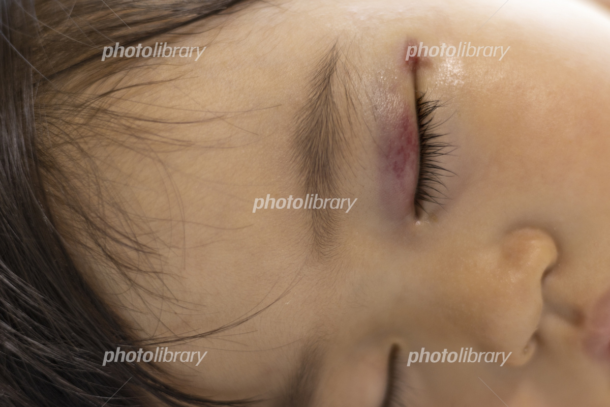 目をぶつけて まぶたが腫れて内出血している赤ちゃん 2歳3か月 女の子 日本人写真素材7286693- フォトライブラリ。