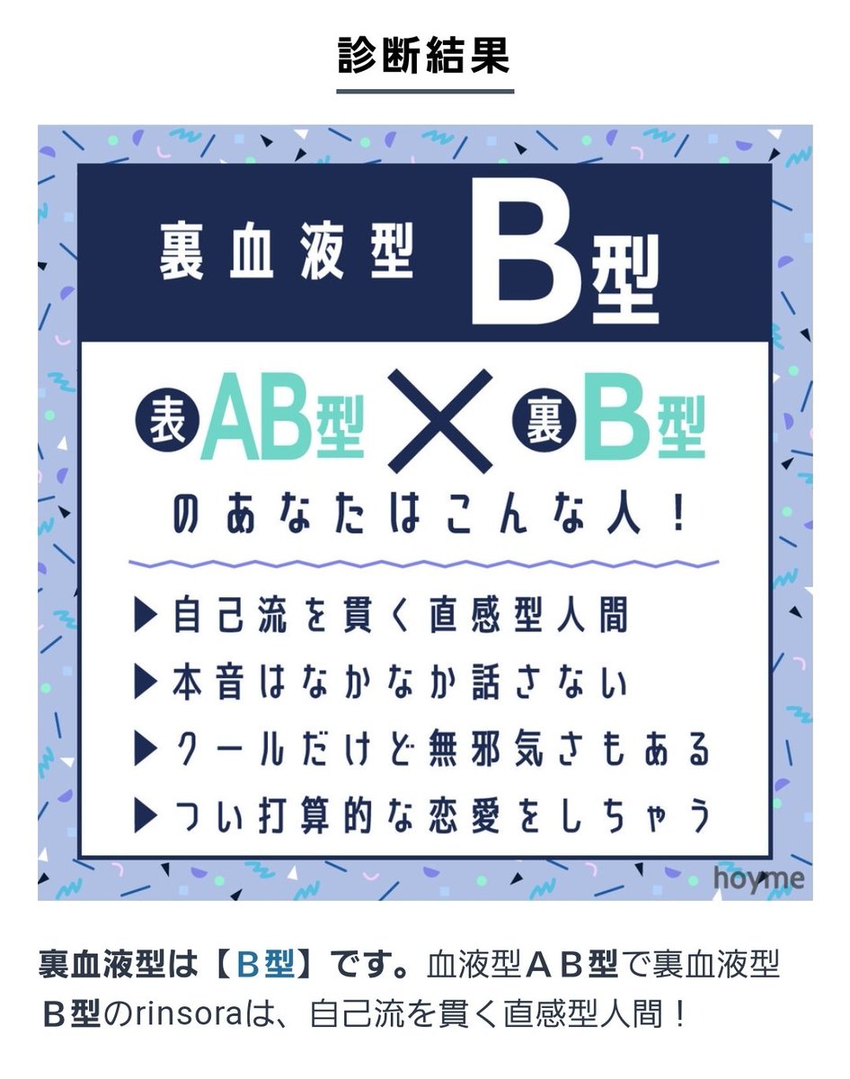 rinsora♡@rinsora1116 : "🆎型の私は裏血液型は B型 です! 表AB型×裏B型のrinsoraって✔️自己流を貫 "。
