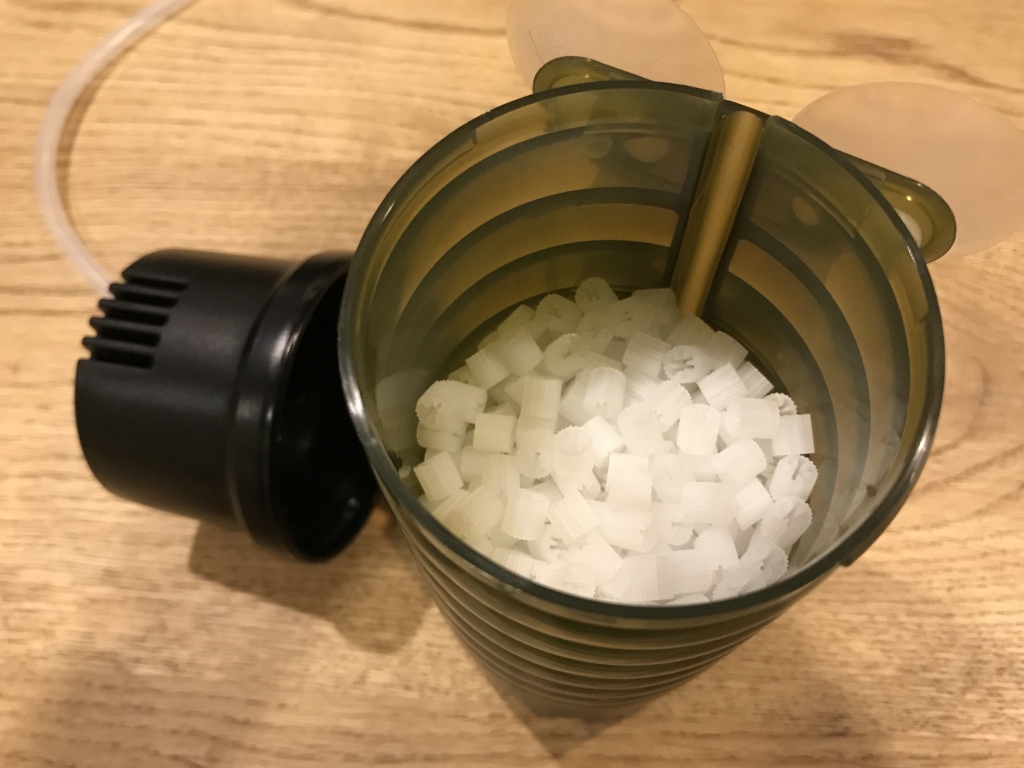 流動式フィルター 上の蓋が外れてぐるぐる回る濾過器の大きいバージョン。判明した欠点情報を添えて。リーフろ材付き流動フィルター大グリーン ふぶきテトラ。