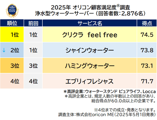 2025年 満足度の高い『ウォーターサーバー』『浄水型ウォーターサーバー』ランキング 『ウォーターサーバー』は ジャパネットウォーター 富士山の天然水が調査開始以来、最多の5年連続総合1位。