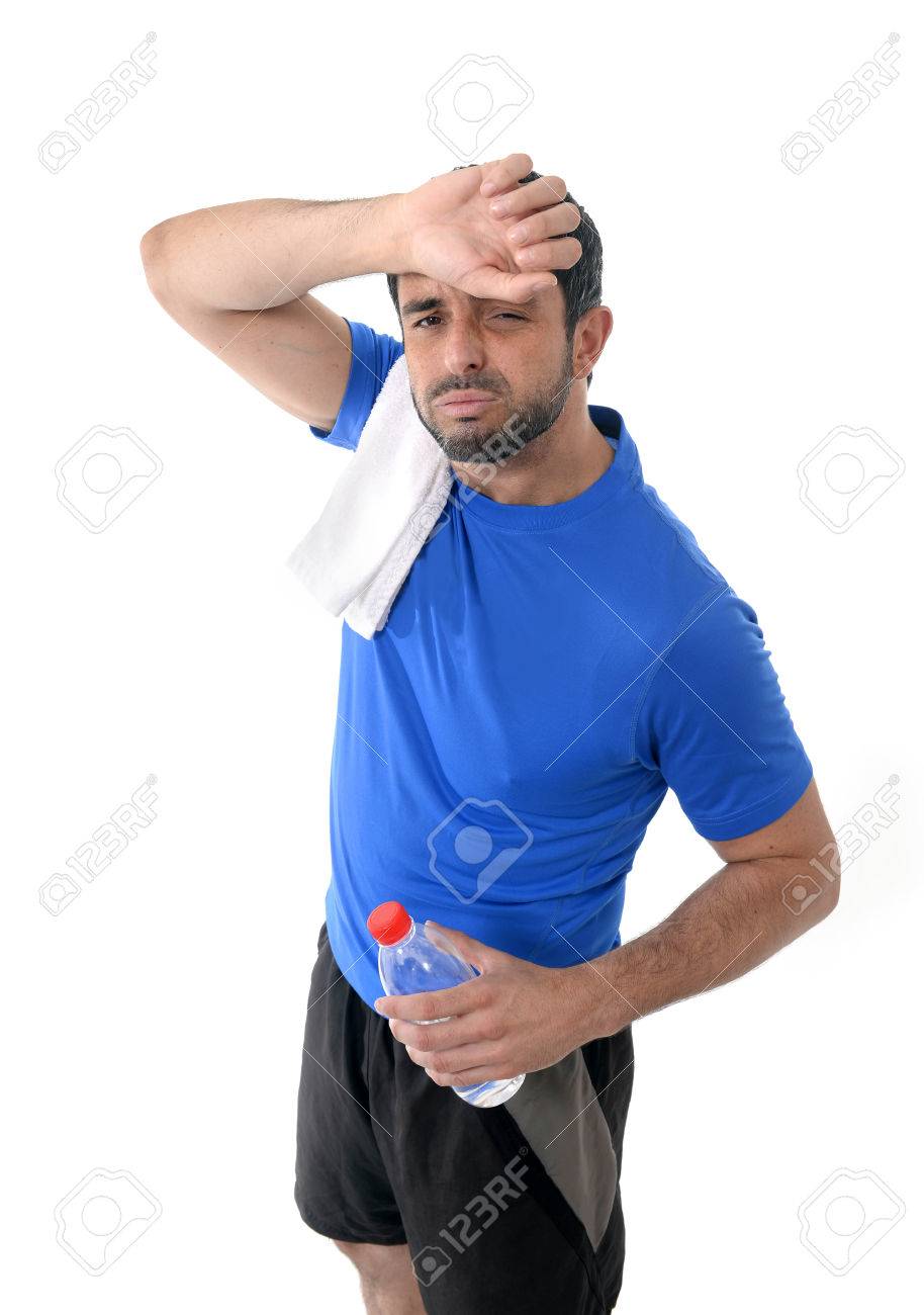 練習後は額から汗を拭く、水のボトルを保持している白い背景にスポーティなヨガの女の子の写真素材・画像素材 Image 35435803。