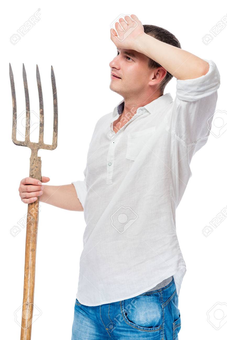 彼は額から汗を拭く手に熊手と白いシャツの農民は分離の写真素材・画像素材 Image 75763100。