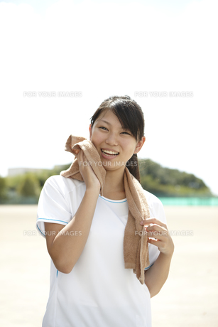 学校のグラウンドでタオルで汗を拭くTシャツの女子高生の写真素材FYI00471327ストックフォトの QleanMarket キュリンマーケット。