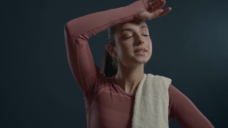 タオルを肩にかけている女性が額の汗を拭うところの動画無料の動画素材サイト「動画AC」。