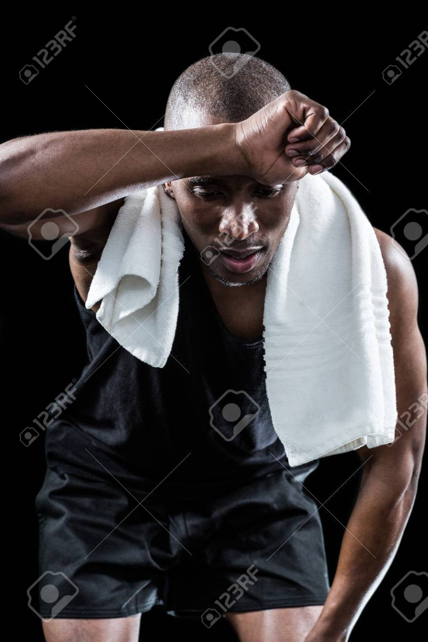 黒の背景に曲げながら手で汗を拭く選手の写真素材・画像素材 Image 45520376。