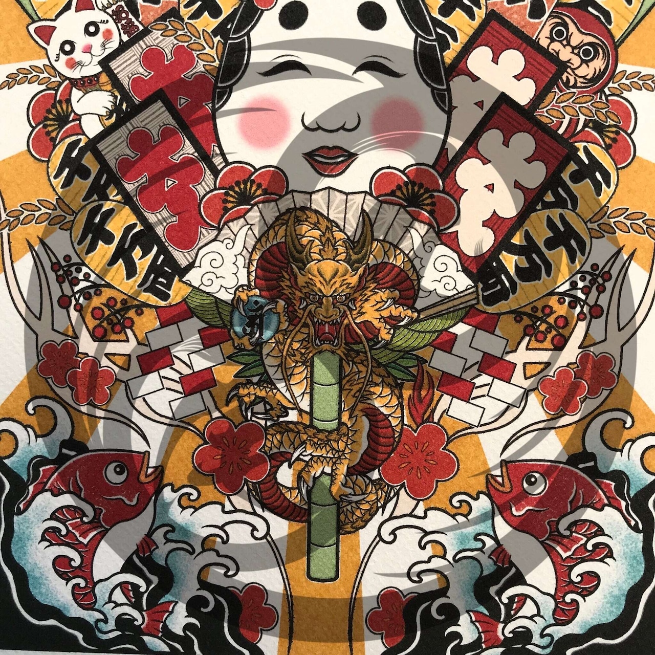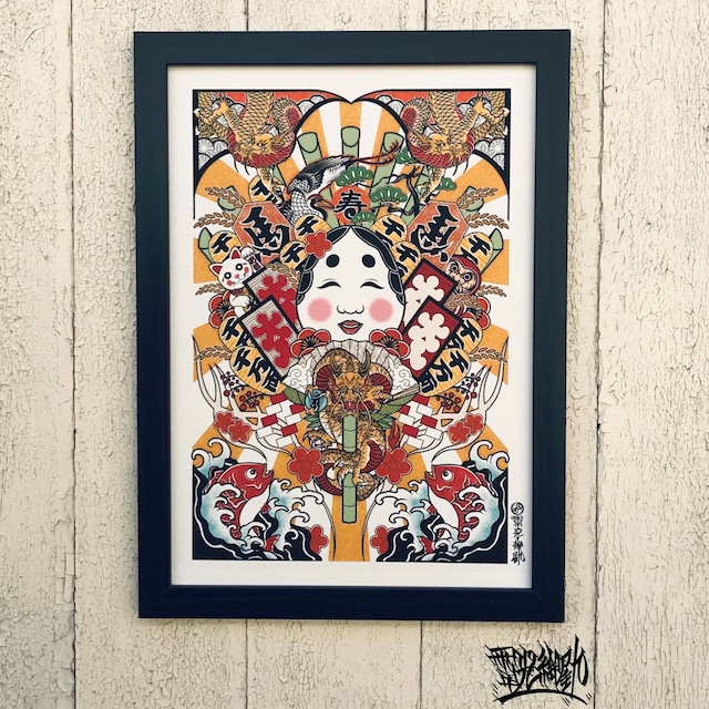 尾九 吉祥画 縁起熊手 辰年 龍 おかめ A4サイズ フレーム付きbbqcomic。