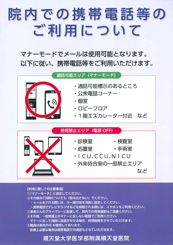 院内での携帯電話等のご利用順天堂大学医学部附属順天堂医院。