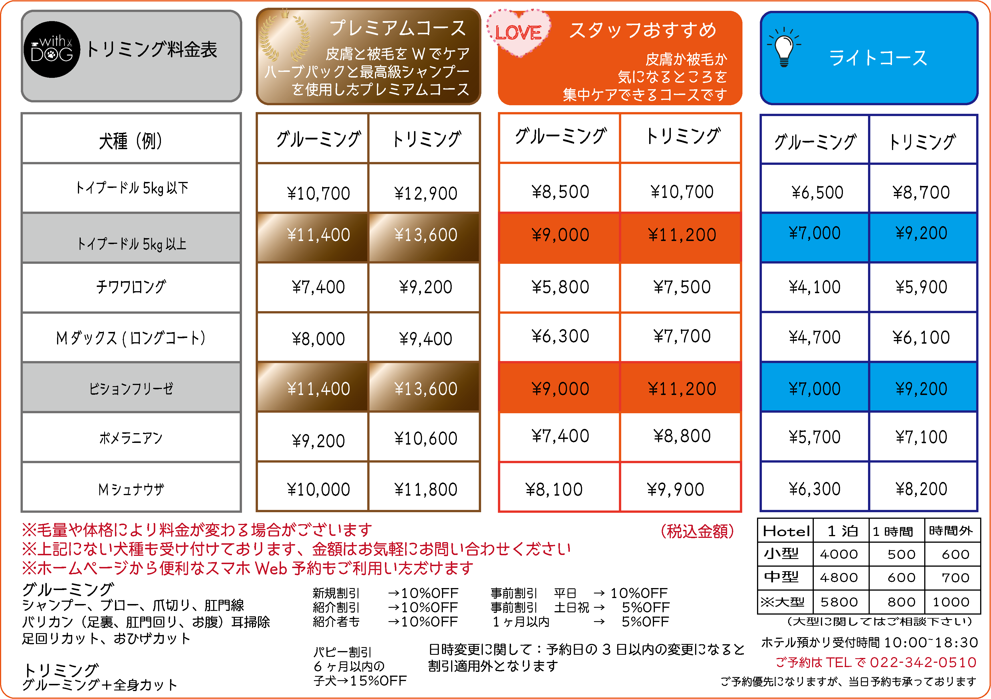 仙台のトリミングサロン料金表トリミングサロン・わんわん幼稚園&ペットホテル・犬カフェwithDOG。