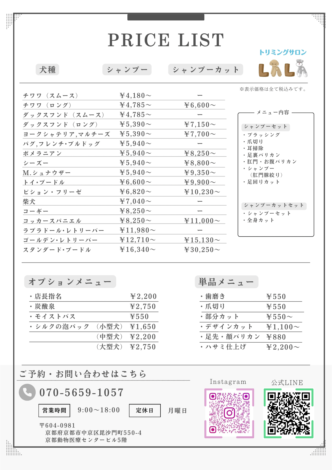 京都市 中京区にあるトリミングサロンLALA御所南動物クリニックトリミング料金改定のお知らせ。