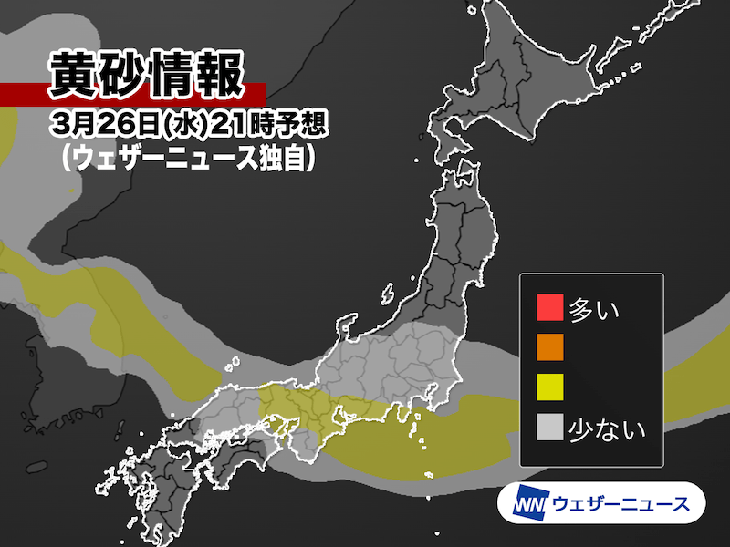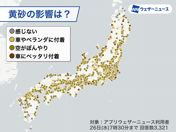 ウェザーニュース@wni_jp : " 今日も黄砂注意昨日から日本列島の広範囲に黄砂が飛来しています。今日26日 水 も九州から東北に "。
