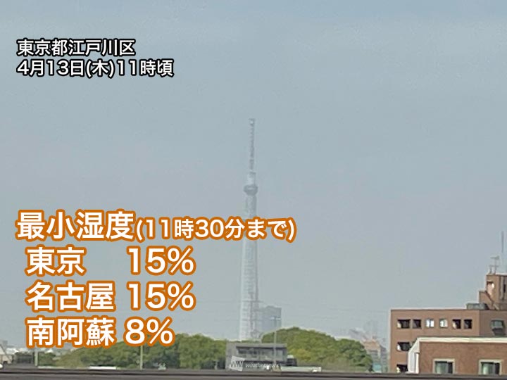 ウェザーニュース on X: "<空気乾燥 黄砂も残り喉のケアをしっかりと>穏やかに晴れている今日13日 木 は関東や東海などで空気が乾燥しています。各地で湿度が10%台まで低下してきました。https:t.co ryjyaWrUgV https:t.co LRxPotMU8J"X。