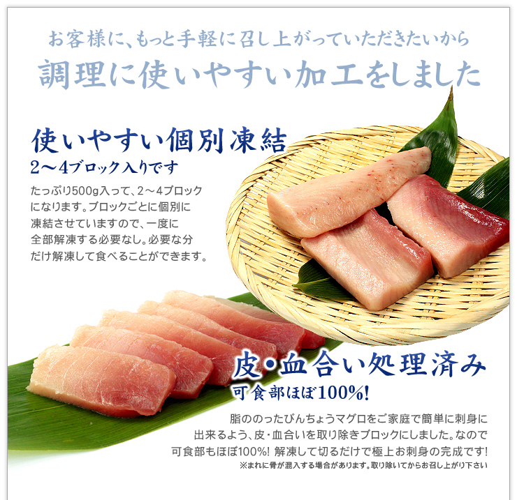 トロびんちょうまぐろ500g 脂のりの良いものを厳選 皮・血合い処理済みで可食部ほぼ100%!解凍レシピ付 bn1pbt-al1 yd9大トロ びんちょう500gまぐろ処一条。
