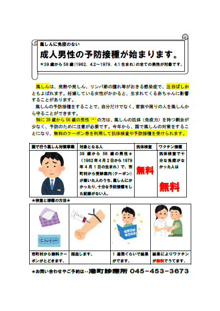 風しん追加対策事業 第5期定期接種 のご案内横浜市に現住所登録のある方横浜南まほろば診療所。