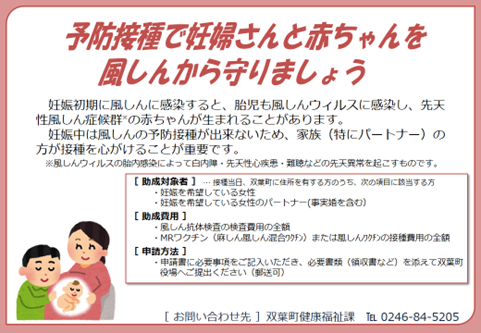 風しん抗体検査・予防接種費用助成のお知らせ~予防接種で妊婦さんと赤ちゃんを風しんから守りましょう 双葉町公式ホームページ。