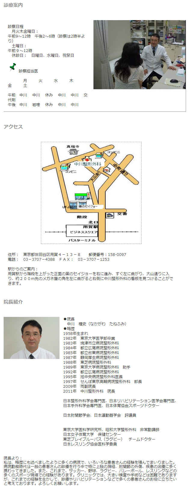 中川整形外科東京都世田谷区用賀の中川整形外科の診療時間・休診日・アクセス方法ならクリニック・病院検索の メディカルライフ。