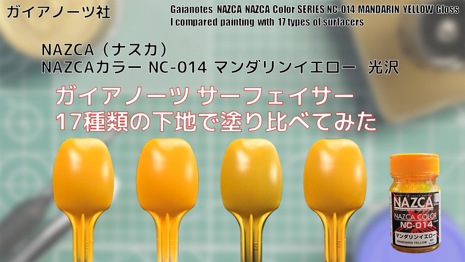 ガイアノーツ NAZCAカラー NC-014 マンダリン イエロー 光沢 MANDARIN YELLOWをガイアノーツ サーフェイサーGaiasurfacers17種類の下地に塗装して比較してみた。 - PM PAINTプラモデルの塗装・塗料を詳しく解説。