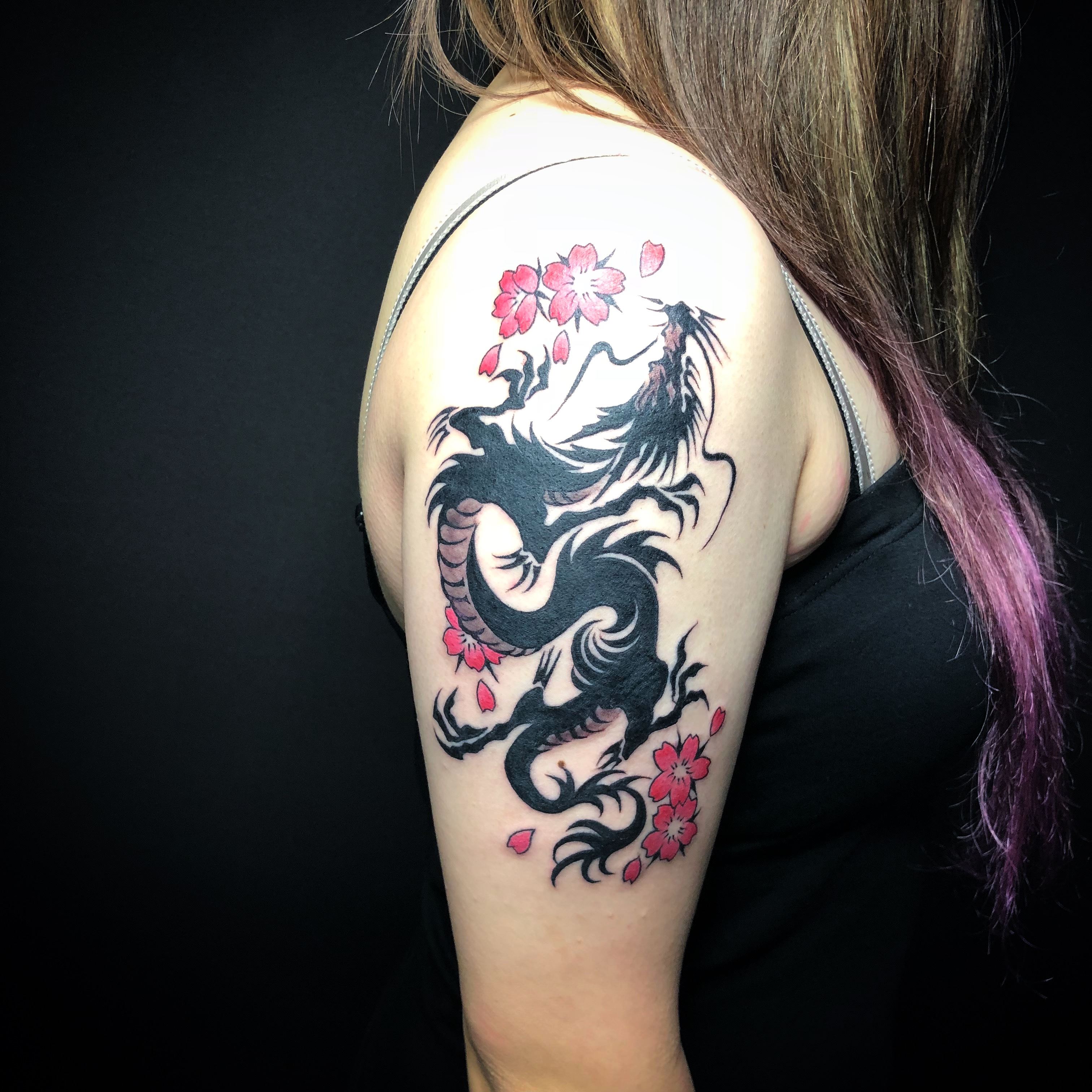 腕にトライバルの龍に桜散らしのタトゥーtattoo 千葉幕張刺青irezumi 千葉女性彫師千葉タトゥーは千葉市花見川区幕張本郷のFREE:ZTATTOOフリーズタトゥ。