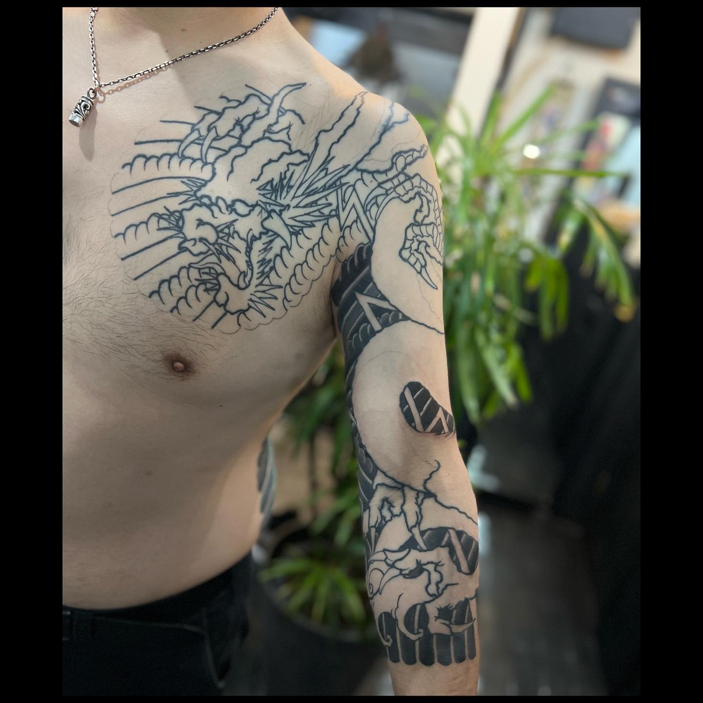 胸、腕 龍ラインdoragonlinefirsttattoofreehandJapanesetattootattooinkTokyoshibuyahorimasa龍竜ドラゴンタトゥーフリーハンド刺青墨渋谷彫雅東京渋谷。