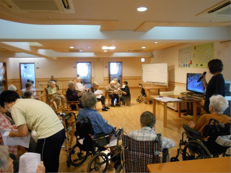 令和6年9月 高齢者 座ったまま うた体操 リズム体操 デイサービス レク 椅子 運動 童謡 唱歌 夏秋 高齢者施設 老人ホームのイベントWithout Instruction。