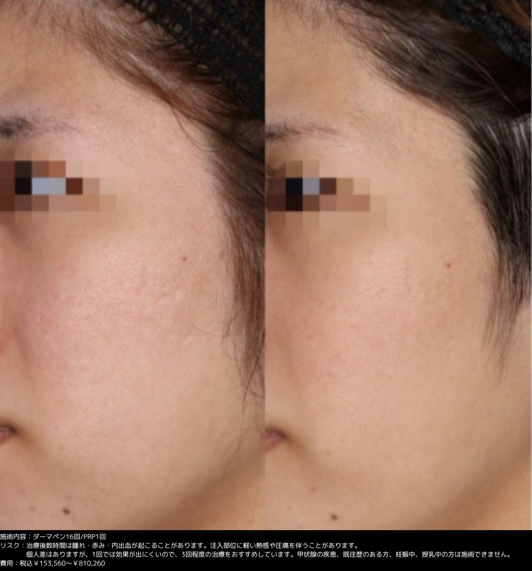 Before 施術前 After174日後 □PRPダーマペン 施術費用:6回 3回コース×2198,000円 税込 ×2リスク:腫れ、内出血など PRP美肌ダーマペンとはご自身の血液で生成する 成長因子 PRP をダーマペンを用いて肌に塗布することで肌の再生を促進させる治療法です。