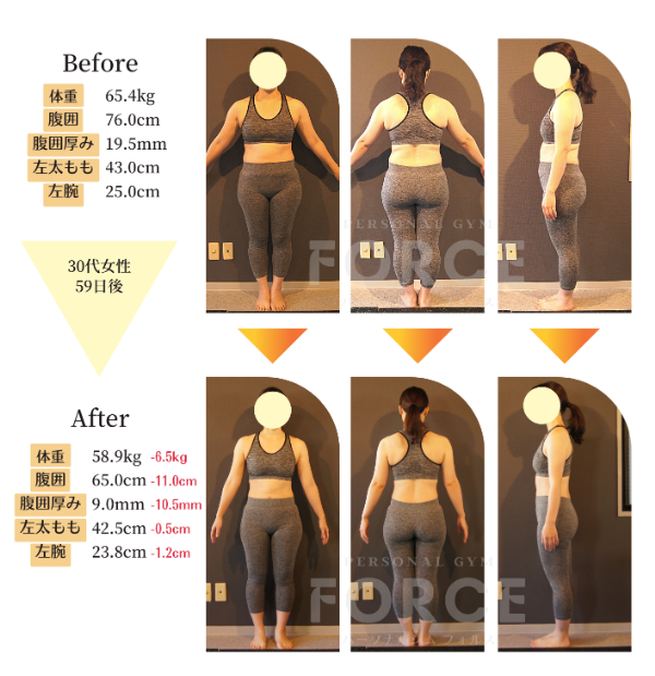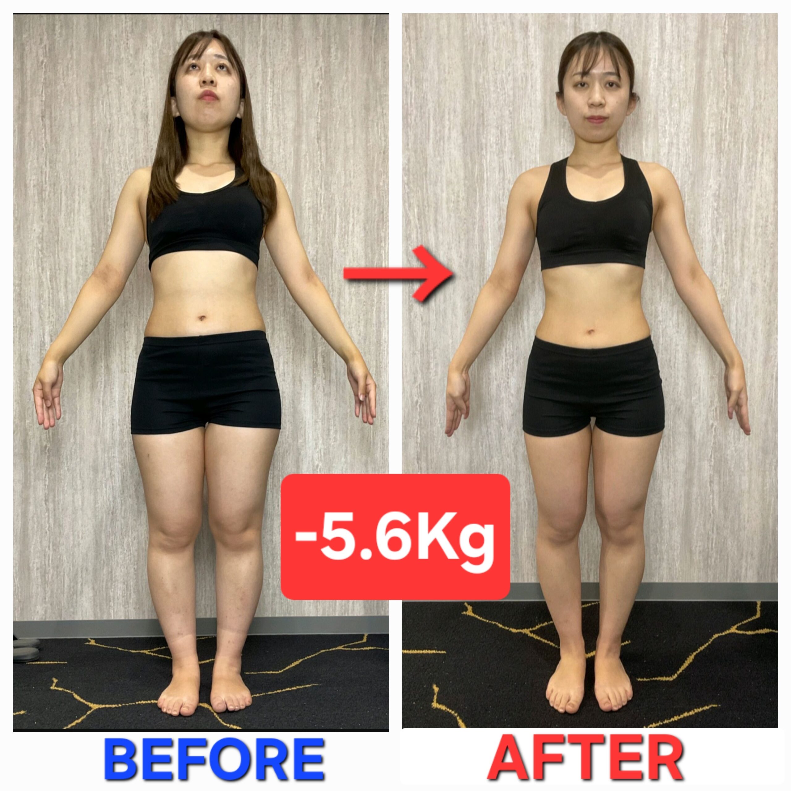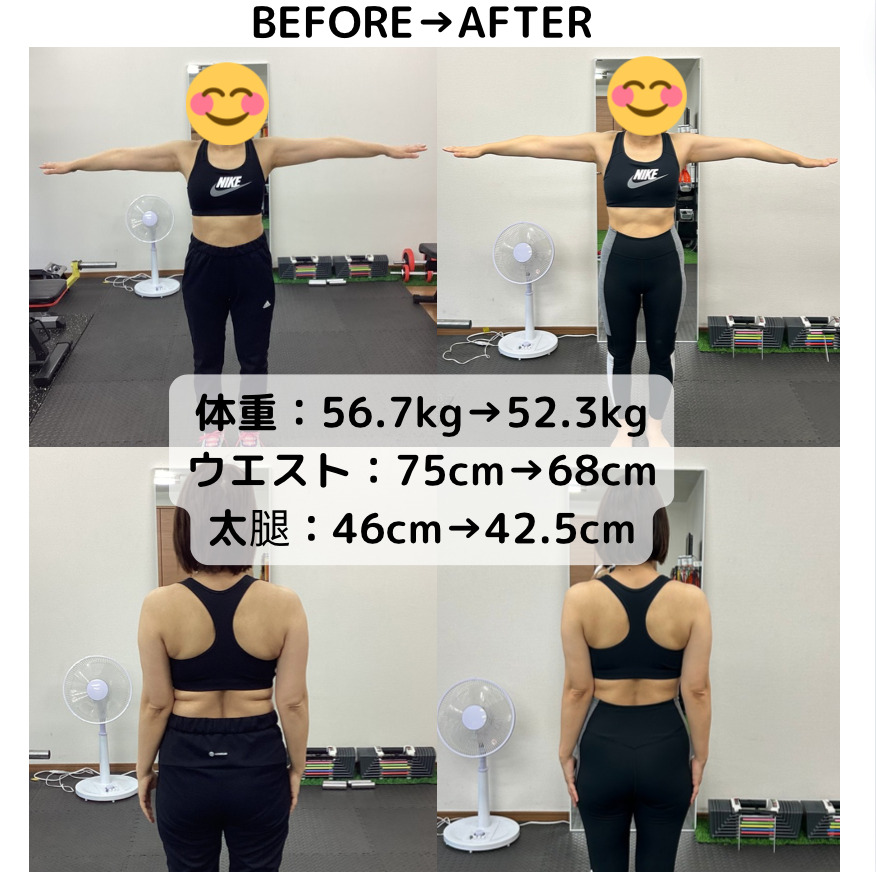 ビフォー&アフター体重-10kg 体脂肪-6.9% ウエスト-12.5cmパーソナルトレーニングジムWHOEVER フーエバー。