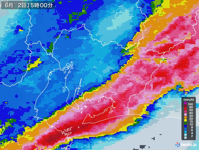 愛知県の過去の雨雲レーダー 2023年06月02日- 日本気象協会 tenki.jp。