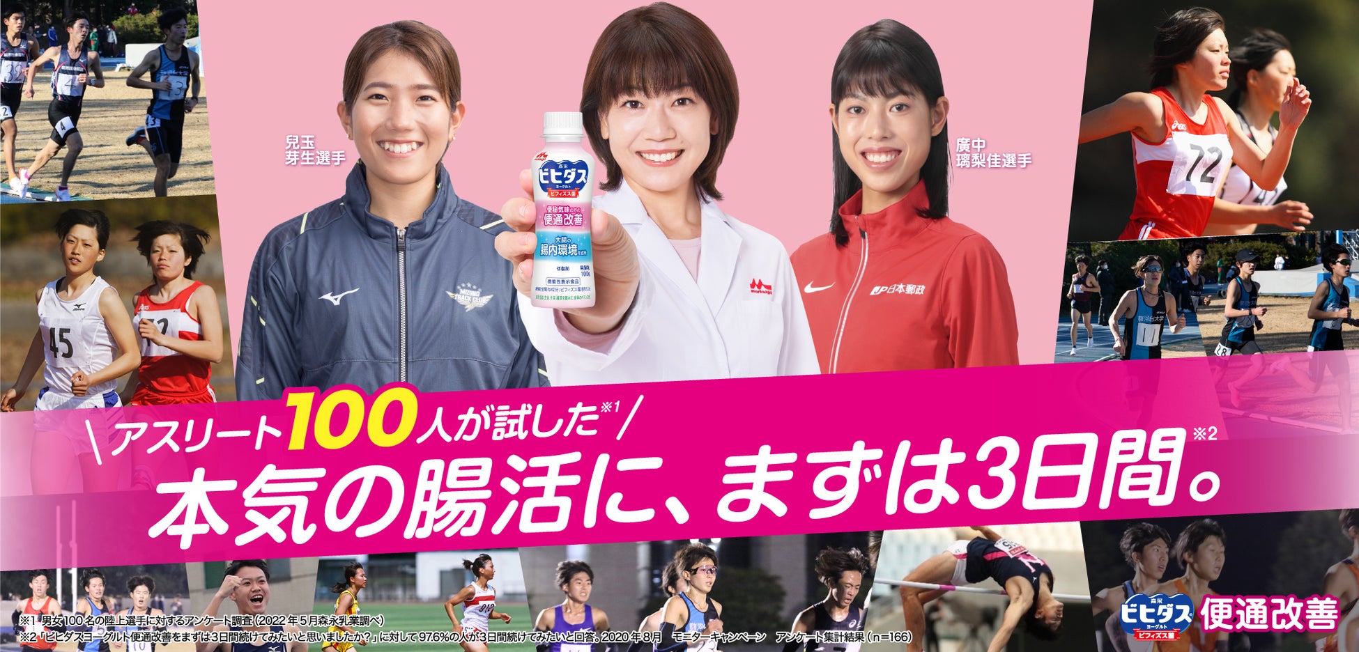 ビヒダス便通改善プロジェクト※1!「ビヒダス ヨーグルト 便通改善」は高橋尚子さん、現役活躍中の廣中璃梨佳さん、兒玉芽生さんが認める「アスリートの本気の前の必需品」森永乳業株式会社のプレスリリース。