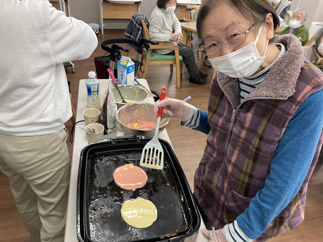 本日は、午後からおやつ作りレク を行いました。 ホットプレートを使ってホットケーキ🥞を作りました♪手作りおやつレクデイサービスレクリエーション高齢者デイサービス。
