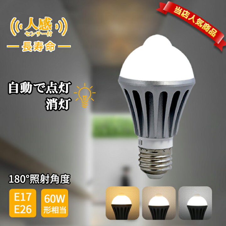 楽天市場 人感センサー LED電球 E17 E26 人感センサー付電球 40W形相当 自動点灯 自動消灯 センサーライト 防犯夜灯 玄関 廊下 洗面所脱衣室 台所 家庭照明 昼光色 電球色 消費電力7W : NICE電気。