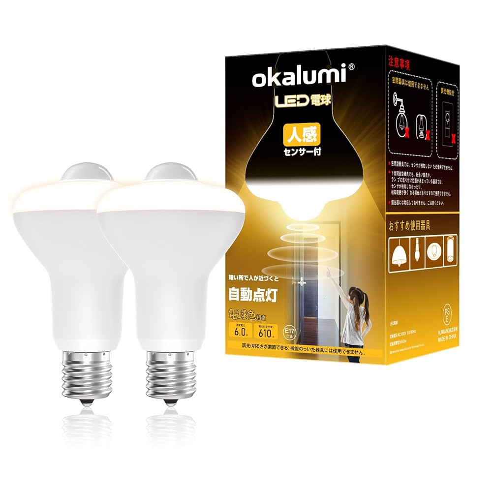 AmazonOKALUMI LED電球 人感センサー付 E17口金 6W 60形相当 小型電球 電球色 610lm 下方向タイプ 明暗センサー付玄関 廊下 トイレ 2個セット 適格請求書発行可OKALUMILED電球 通販。