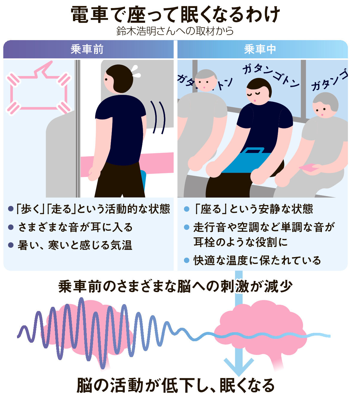 なぜ電車で座ると眠くなるの? 単調な音や適温で脳への刺激が減る:朝日新聞。
