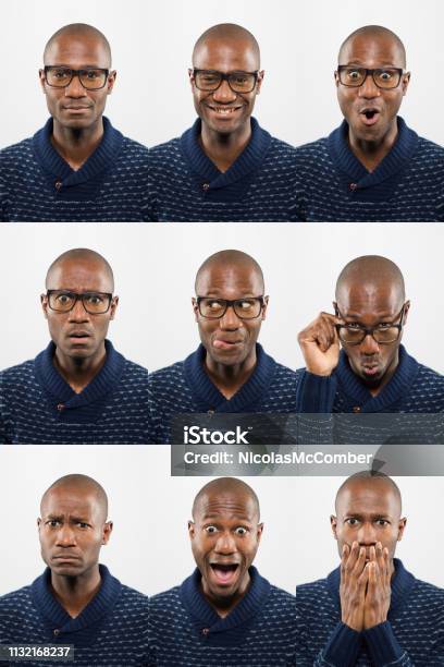 顔の表情を作るメガネを持つ中年のハゲアフリカの降下黒人男性 - 表情のストックフォトや画像を多数ご用意 - 表情, 男性, アフリカ系アメリカ人 -iStock。
