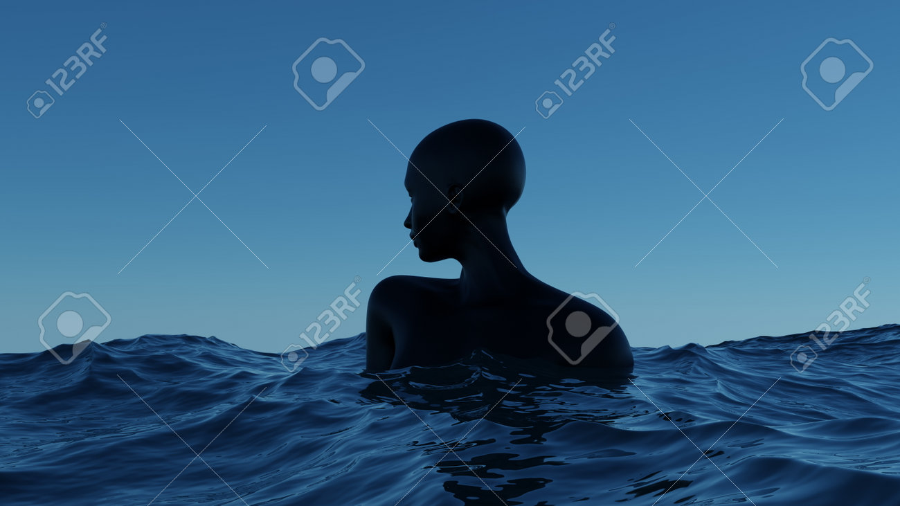 夕日を背景に海にいる黒人女性。髪のない女性、水中のハゲの女の子。3Dレンダリングの写真素材・画像素材 Image 209812380。