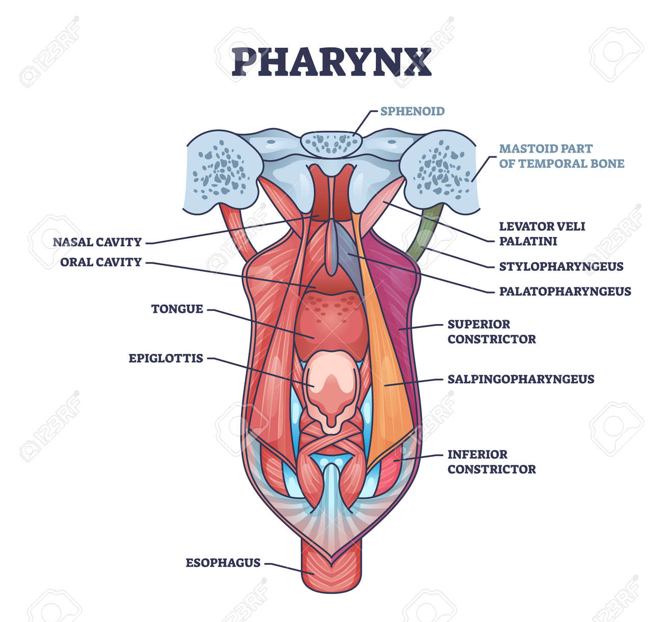 咽頭または喉の解剖学的および医学的口腔構造概要図のイラスト素材・ベクター Image 190177946。