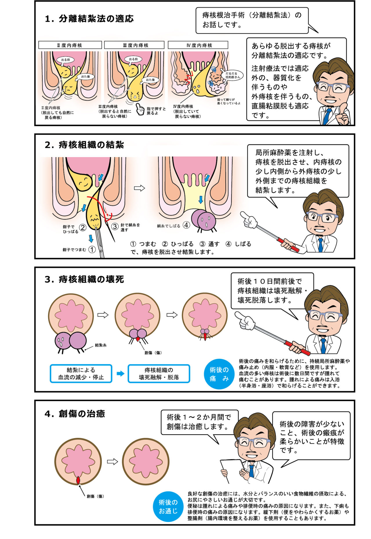 漫画でわかるいぼ痔治療佐賀県杵島郡の森外科医院痔、いぼ痔、ジオン注射、硬化療法、切らない痔の手術。