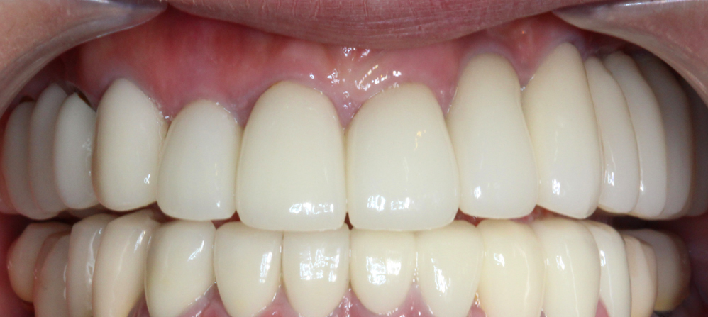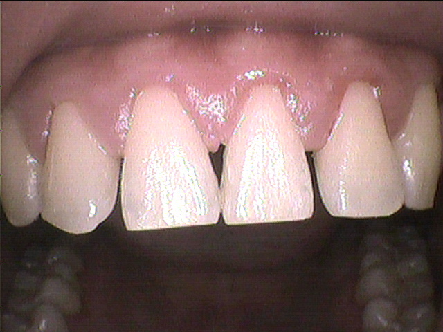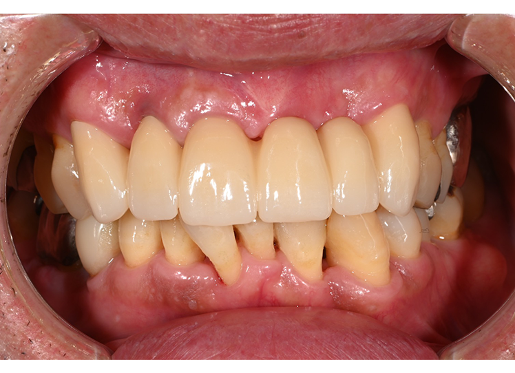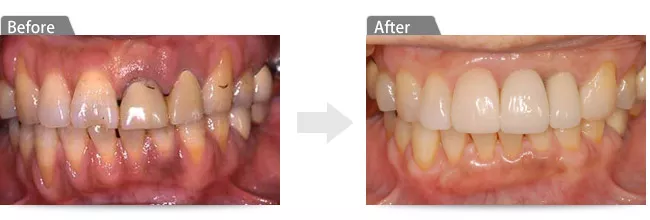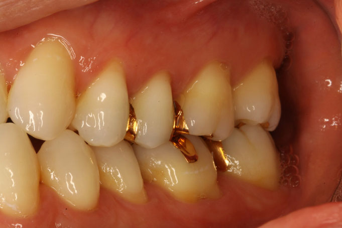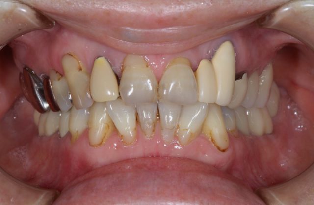 歯茎の下がりにより目立ってきた被せ物をメタルボンドブリッジにより回復した術例 - 岡田歯科医院。